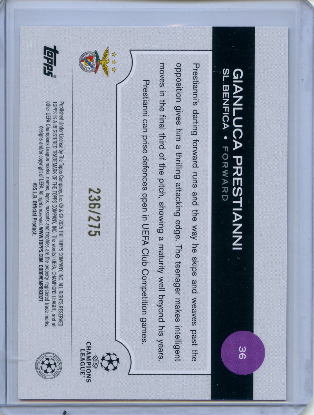2024-25 Topps UEFA Club Competitions Gianluca Prestianni Navy Blue 236/275 #36
