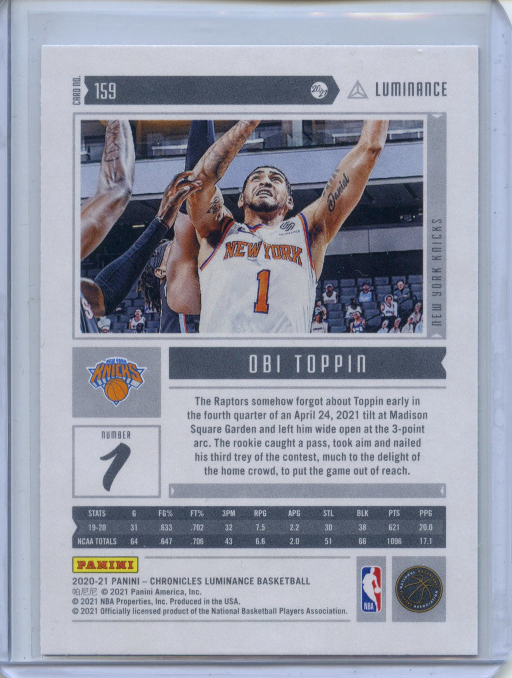 2020-21 Panini NBA Chronicles Obi Toppin Luminance #159